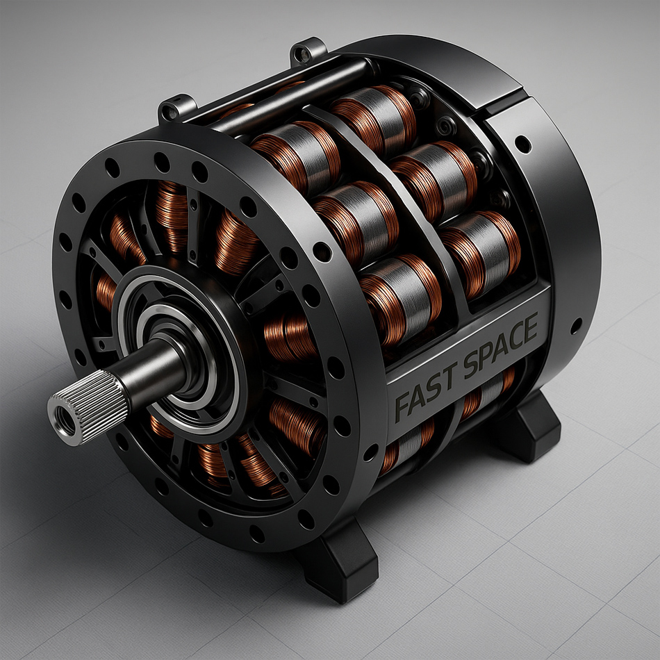FAST Space’s proprietary 12-phase Super Flux Motor is the most advanced electric motor of its kind. Delivering 1,000 horsepower (746 kW) and 1,600 Nm of torque, this unit uses high-strength alloys, graphene composites, and rare-earth magnetic materials for extreme power density.